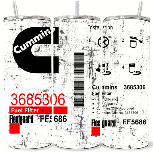 Cummins Replica 20oz Stainless Steel Tumbler, Vintage Distressed Fuel Filter Print, Insulated Multipurpose Travel Mug with Lid & Straw, Hand Wash Only - Reusable, No Electricity Needed