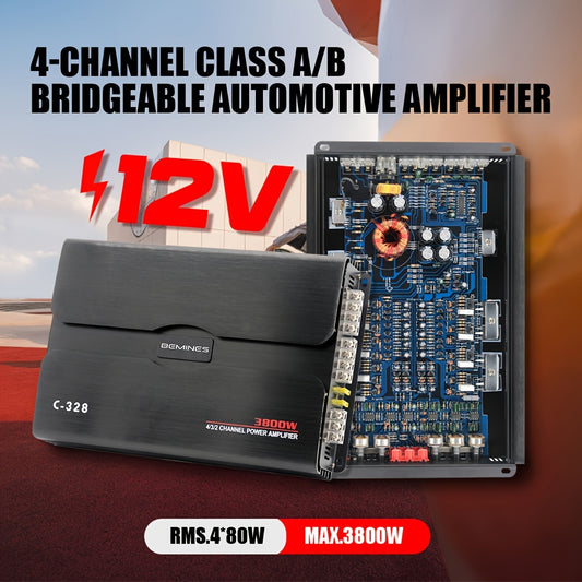 MAX.3800W 4-channel Class A/B Car Stereo Amplifier, RMS.4*80W High Output, 2/4 Ohm Stable, High/low Level Input, Bridgeable, Good Heat Dissipation, Improved Sound Quality, Suitable For Speakers And Subwoofers
