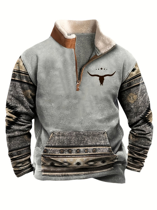 Men's Vintage Print Casual Long Sleeve 1/4 Zip Cowboy Sweatshirt, Western Aztec Fleece Pullover Sweatshirt, Winter Fall