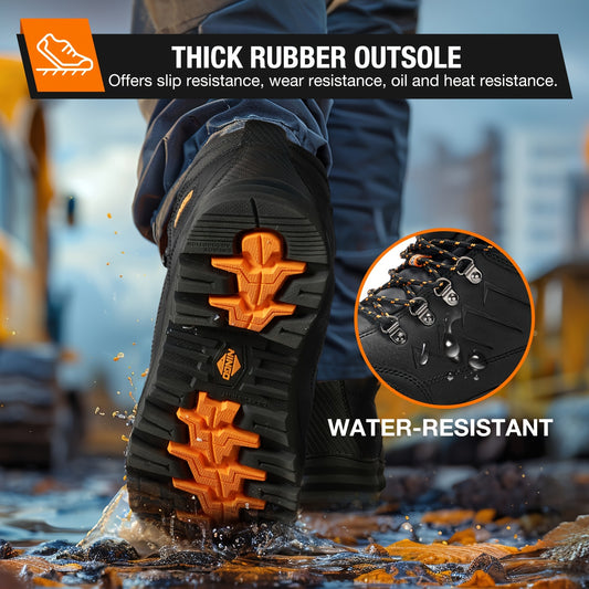NINGO Men's Steel Toe Work Boots, Full Grain, Oil And Slip Resistant, Puncture Proof Construction Boots With Breathable Lining, Anti-static, Mens Safety Boots For Industrial, Warehouse