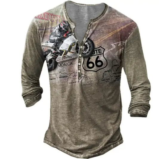 Vintage T-shirt For Men Cotton Tee Route 66 Graphic T Shirts 3D Printing Long Sleeve Tees V-Neck Oversized Men's Clothing Tops