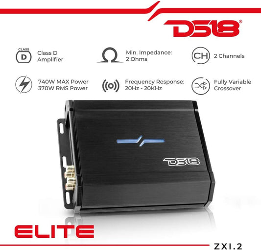 ZXI.2 Car Audio Amplifier - Class D, Full Range, 2 Channel, 370 Watts Max. Adjustable Crossover - Compact Size for Easy Installation on Many Applications
