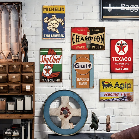 6pc Retro Metal Tin Sign Collection - Old Car Shop Posters, Oil and Gas Station Sign, Man Cave Decor, Cafe Decor, Wall Decorations for Men, 8x12 Inch