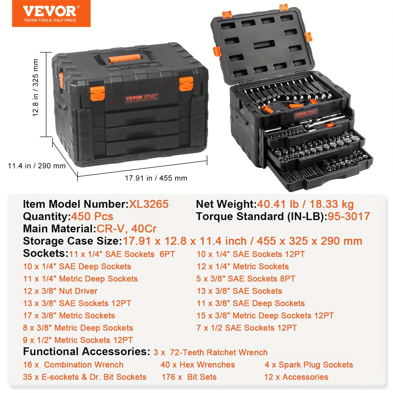 450 Pcs SAE and Metric Mechanic Tool Kit, VEVOR Mechanics Tool Set and Socket Set with 1/4", 3/8", 1/2" Drive Deep and Standard Sockets, Bits, Hex Wrenches, Combination Wrench, Accessories, Storage Case