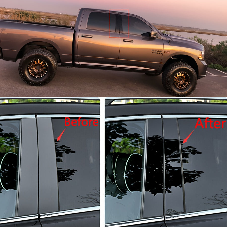 Compatibility: Suitable for Dodge Ram Crew/Quad/Extended Models from 2009 to 2018. Includes 4 pieces made of PC material in Glossy Black color. Meets requirements for highway/off-road driving, extreme temperatures, and high speeds. Special feature: Each door trim piece is fully coated with adhesive, not just the edges.