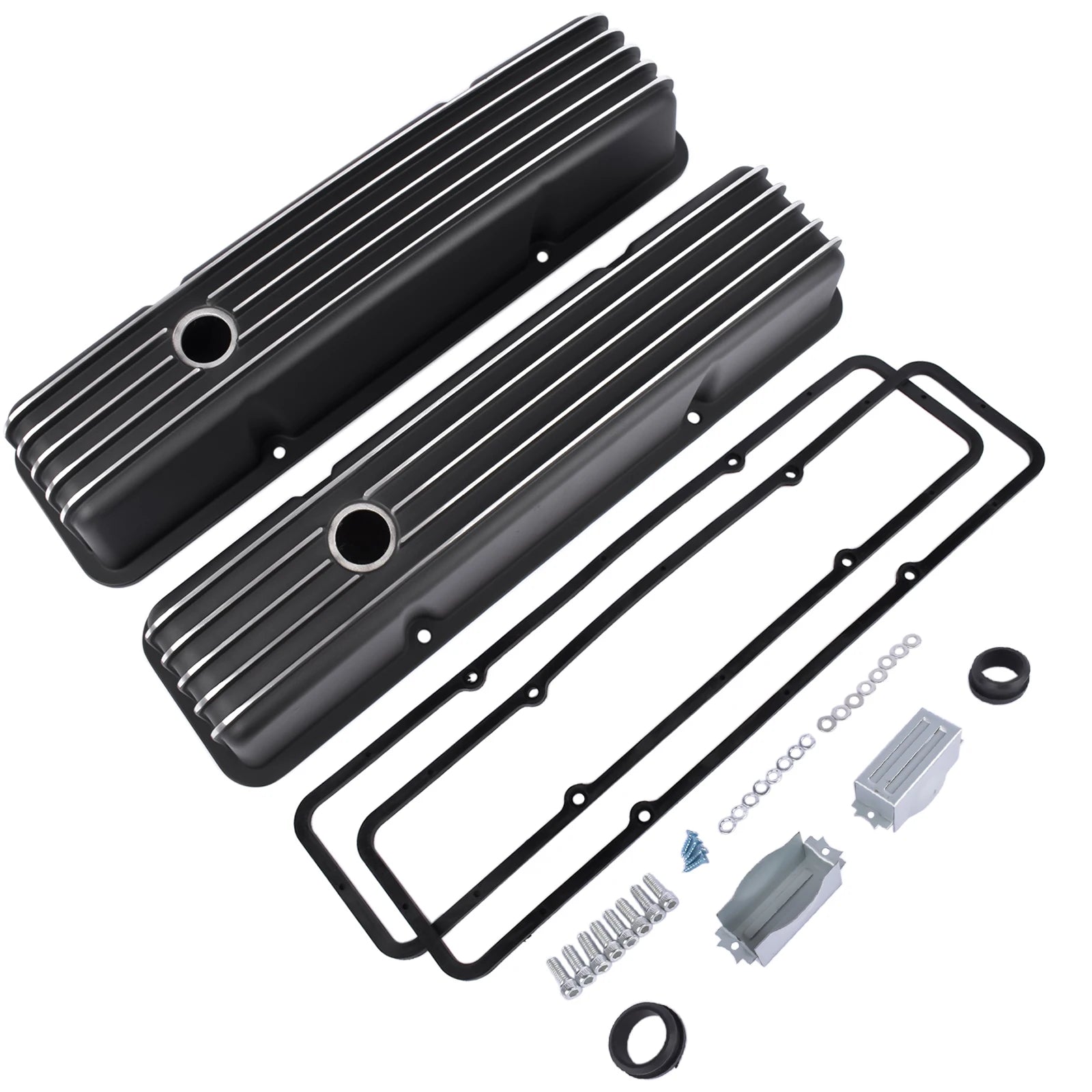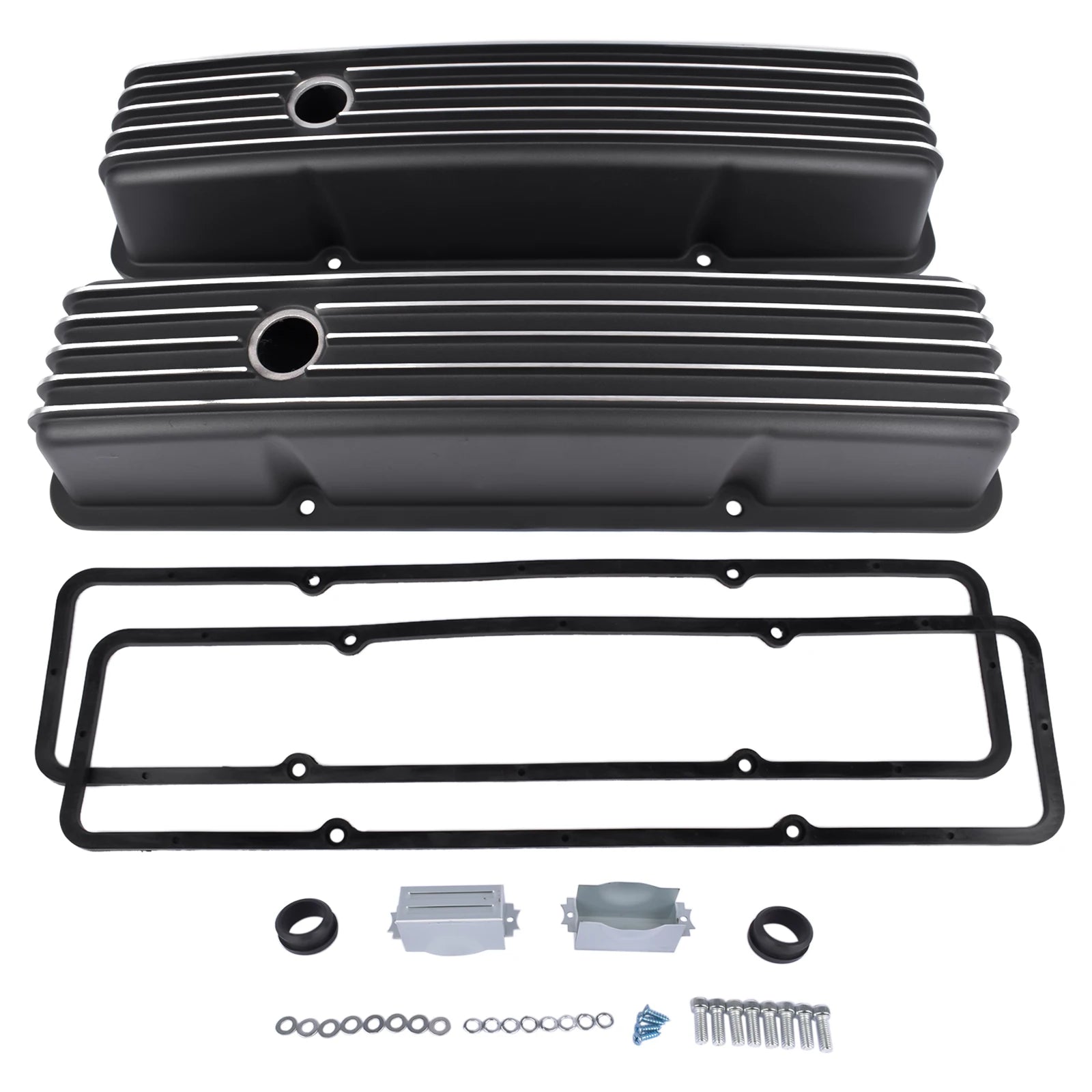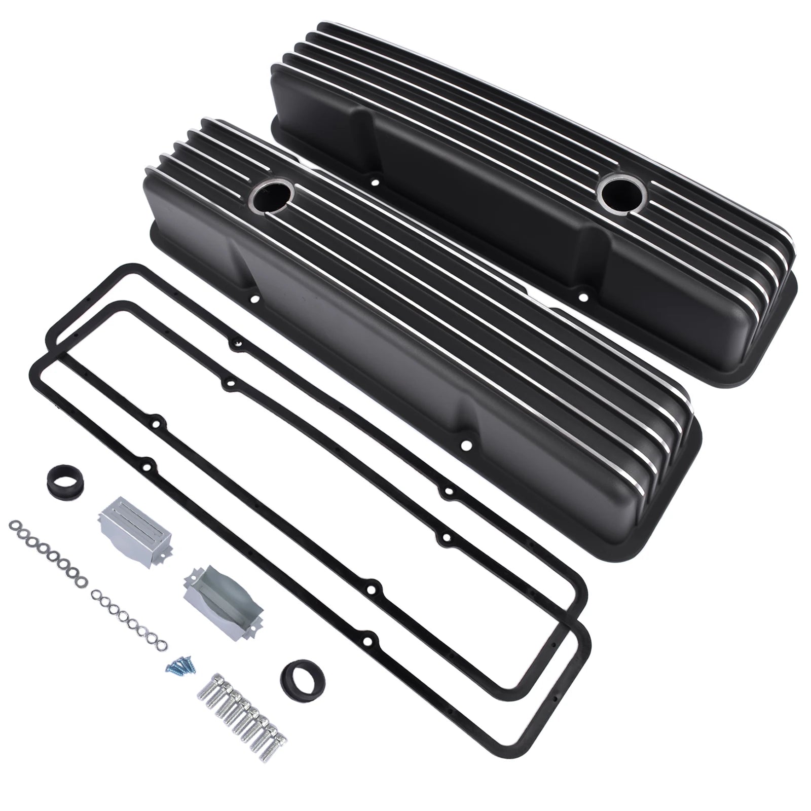 AP02 Aluminum Polished Finned Tall Valve Covers for Chevy SBC Small Block 283 Black