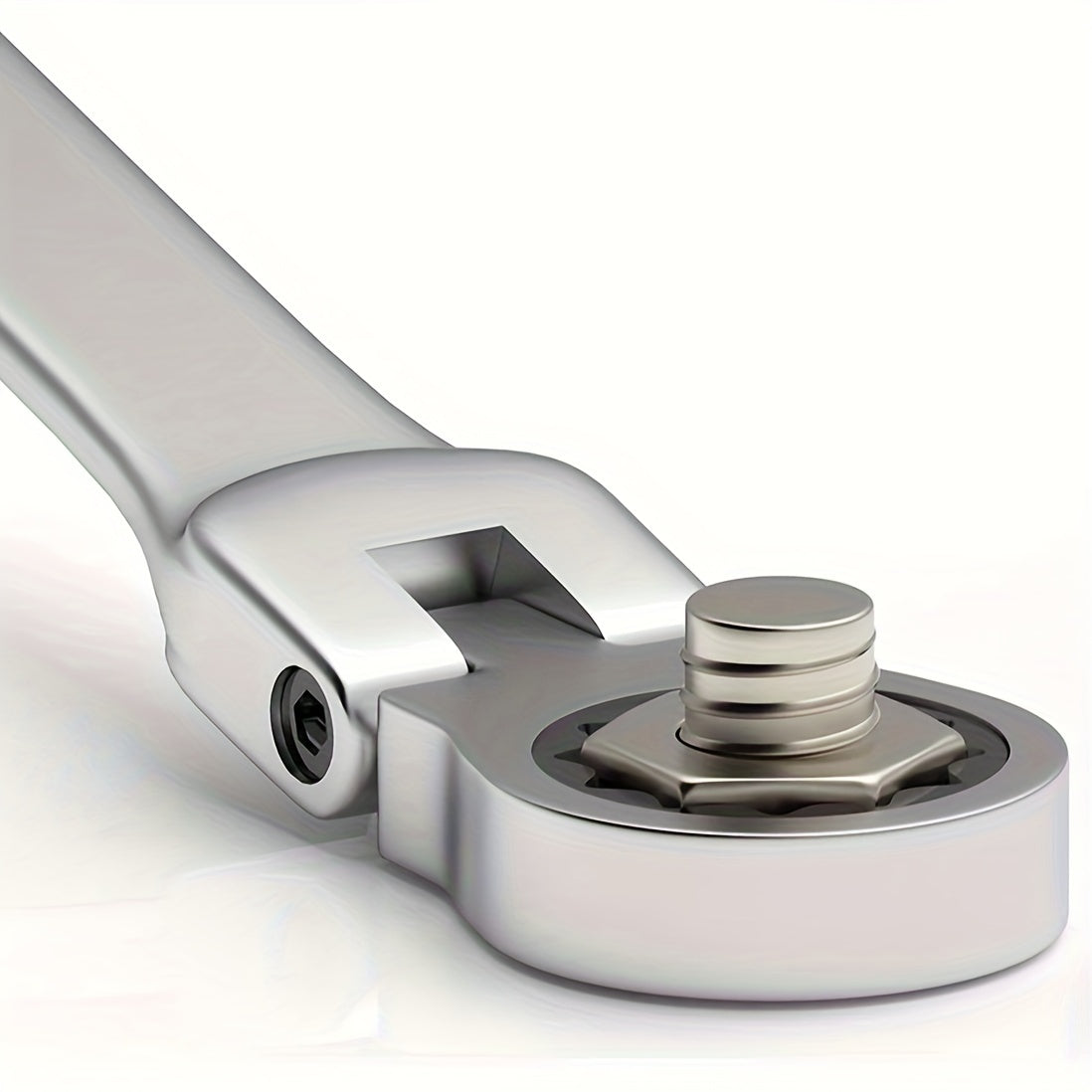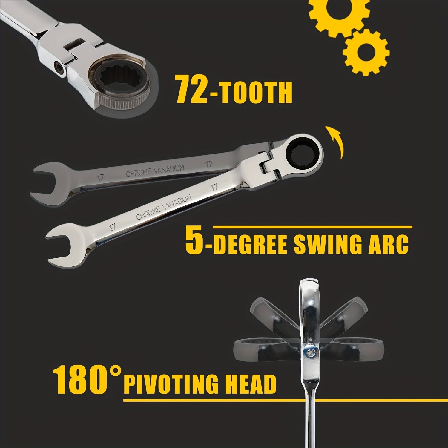 A set of ratcheting wrenches with flexible heads, combination spanner kits, made of chrome vanadium steel. The 72-tooth ratcheting box end requires only a 5° movement to fasten, compared to 30° for standard wrenches. The off-corner loading design on the box end offers improved grip and reduces fastener rounding. The thin head and beam allow for greater access in tight work spaces, while the flexible head provides access to hard-to-reach bolts and fasteners.
