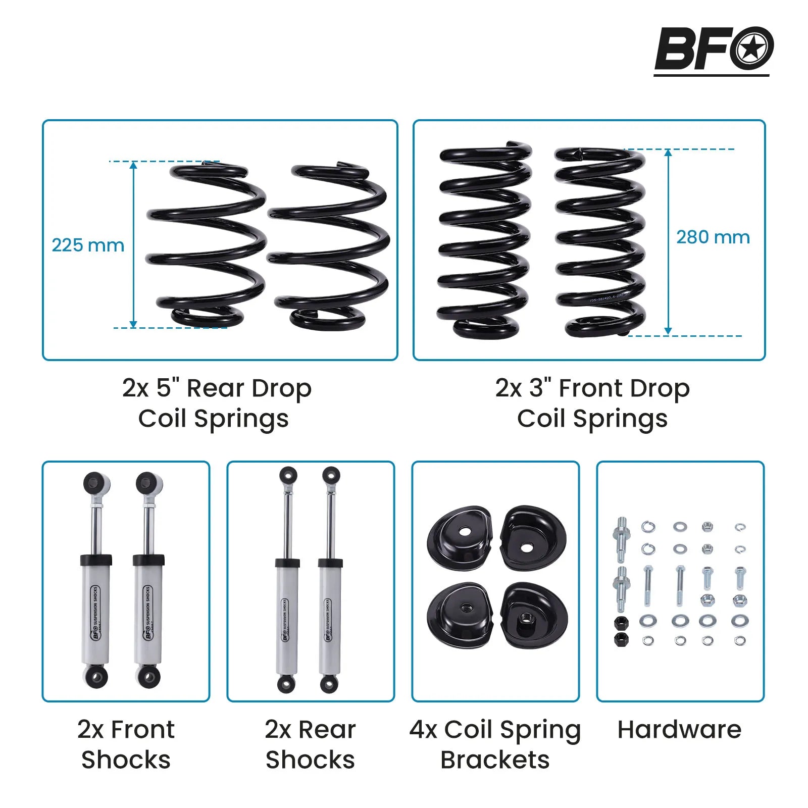 - The front dropped coils and shocks will drop a 3" in the front and 5" in the rear.