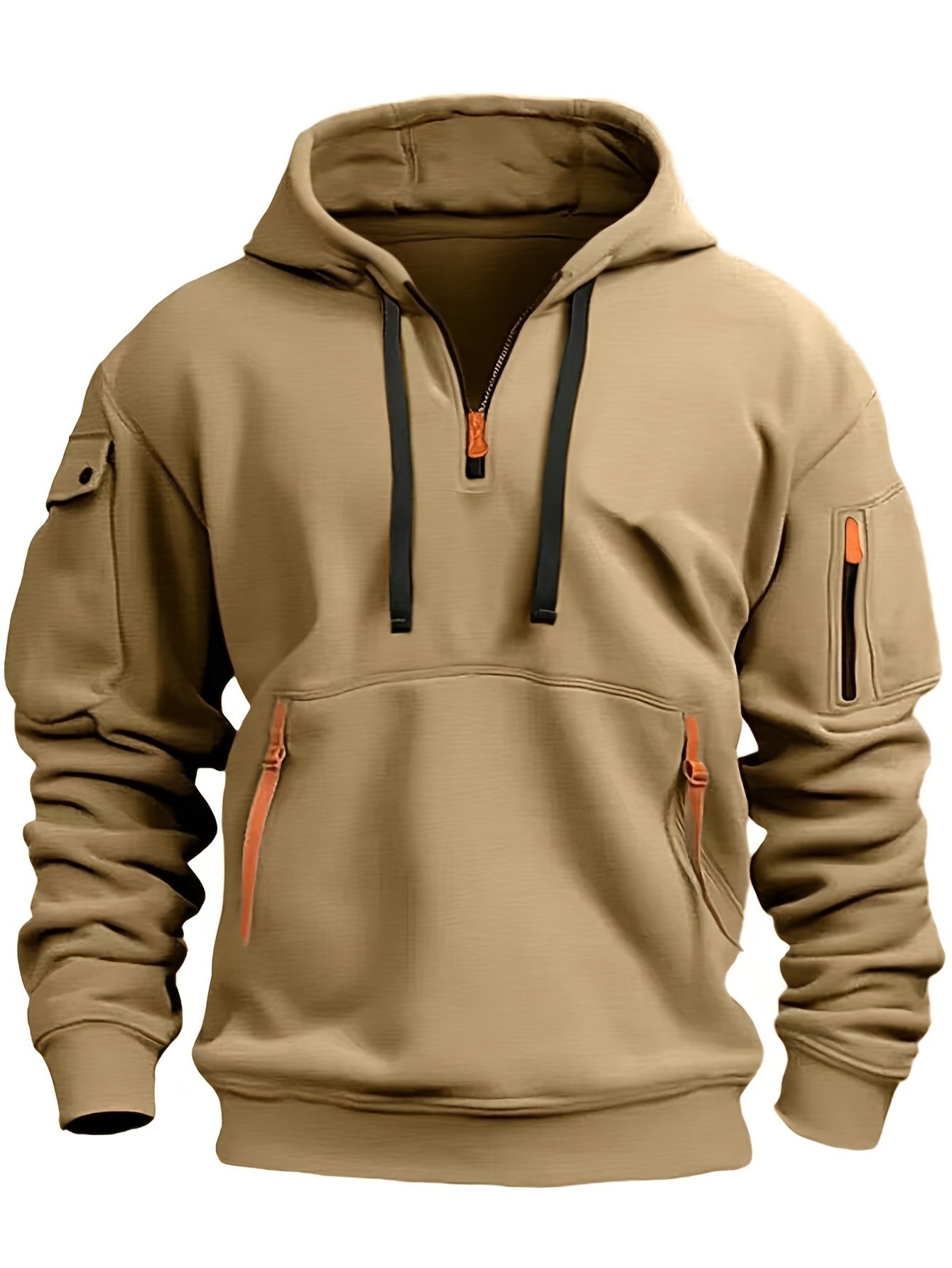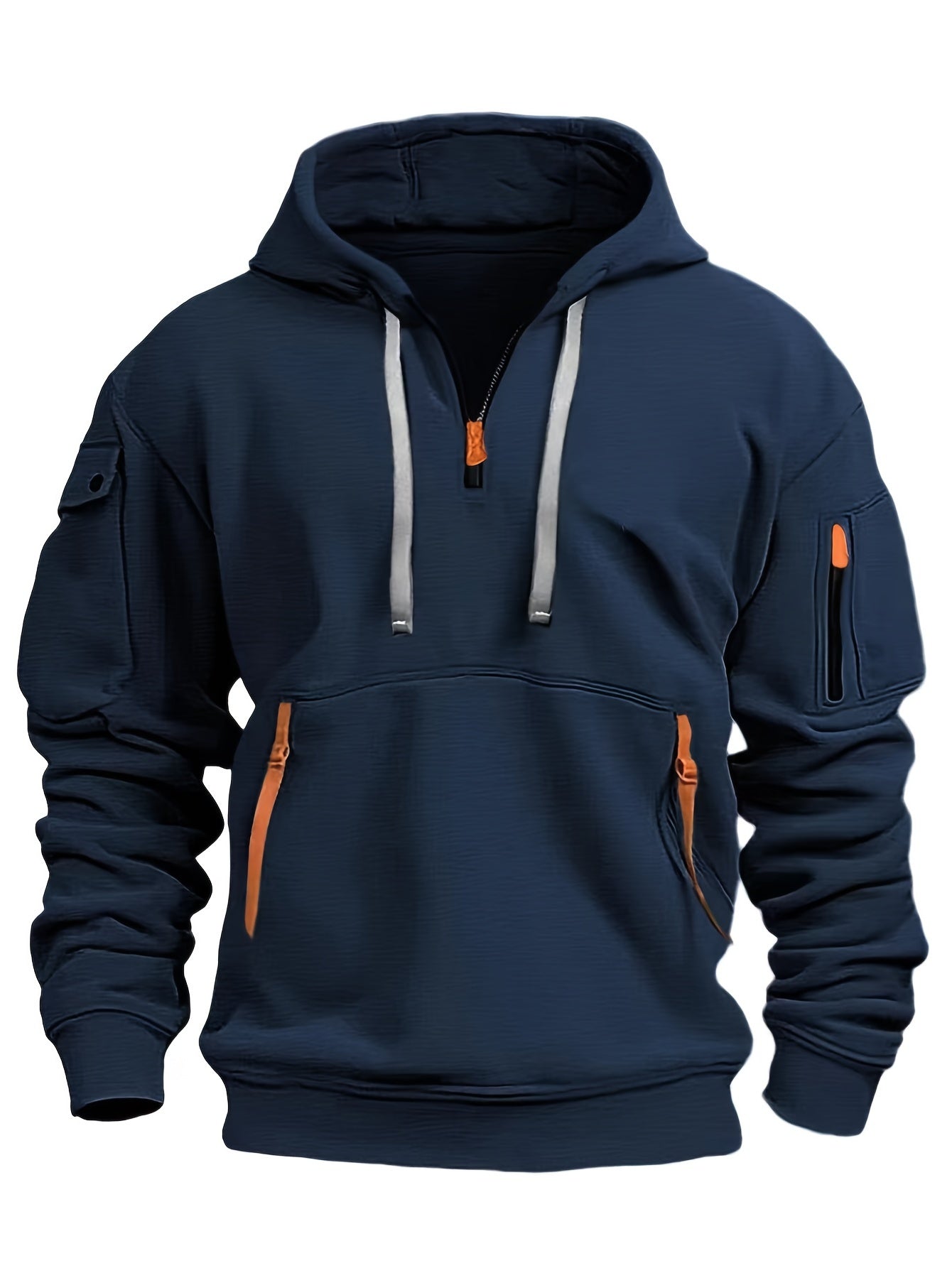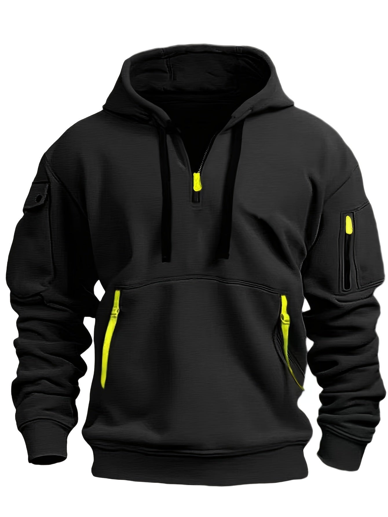Men's Hooded Active Sweatshirt with Arm Pocket Zip Details - 100% Polyester Sports Style Pullover - Solid Color, Regular Fit Long Sleeve with Slight Stretch Knit Fabric