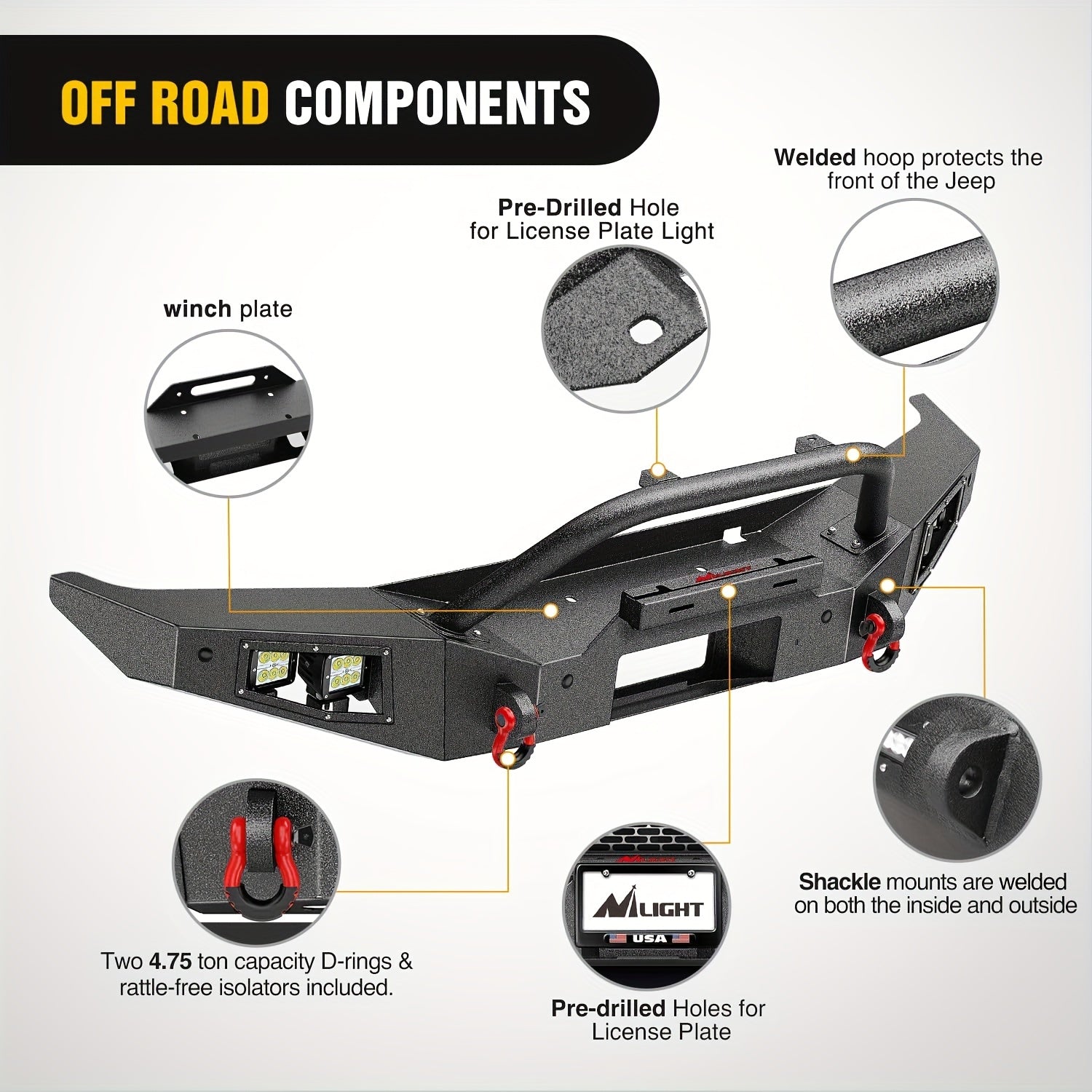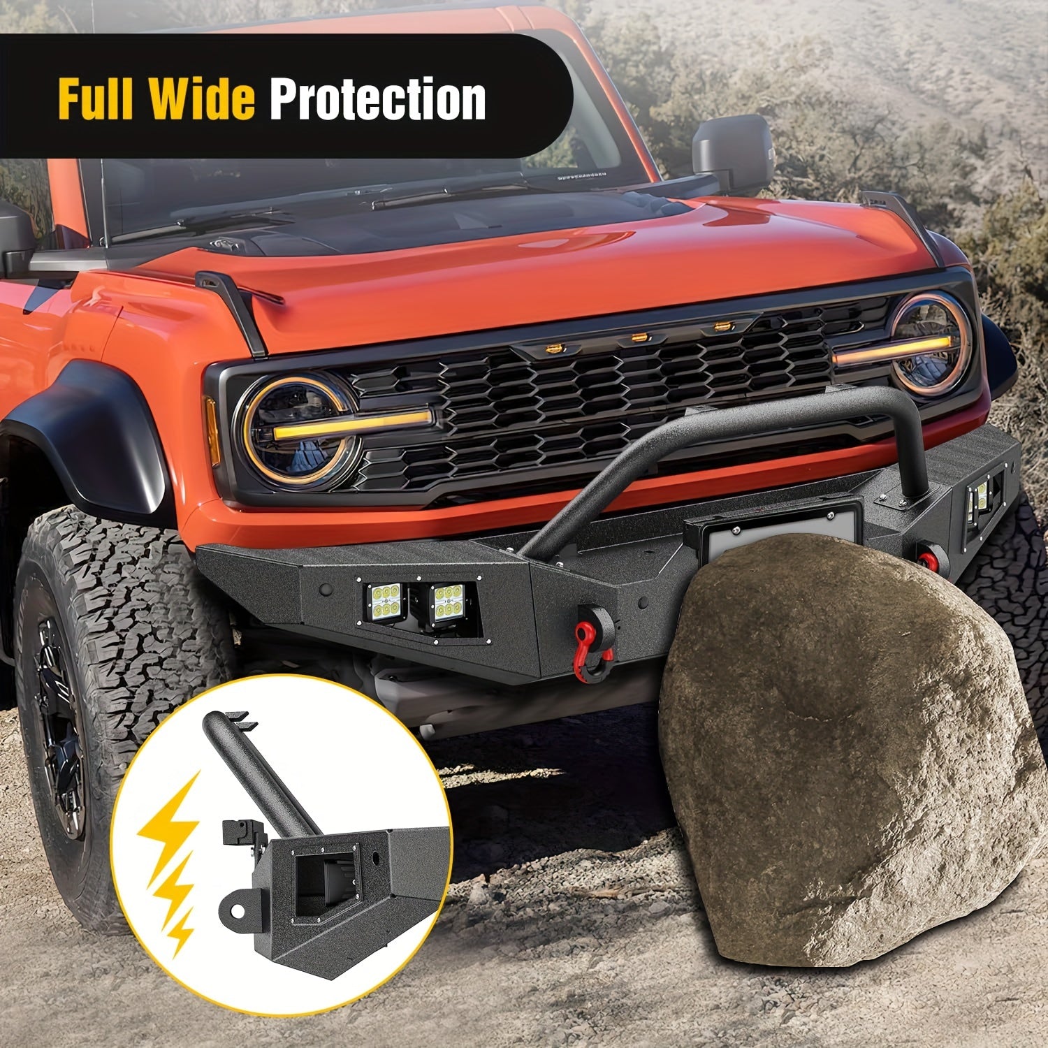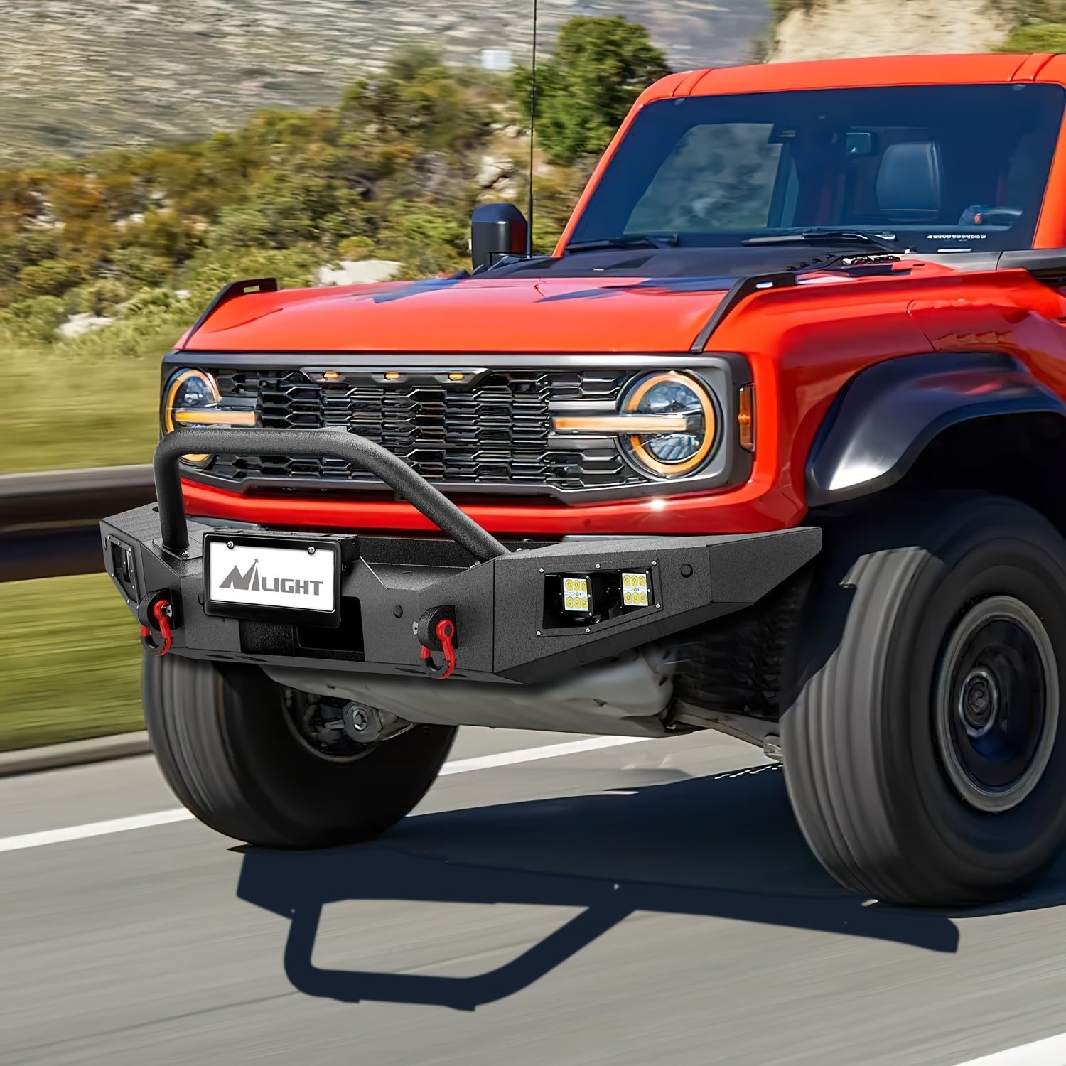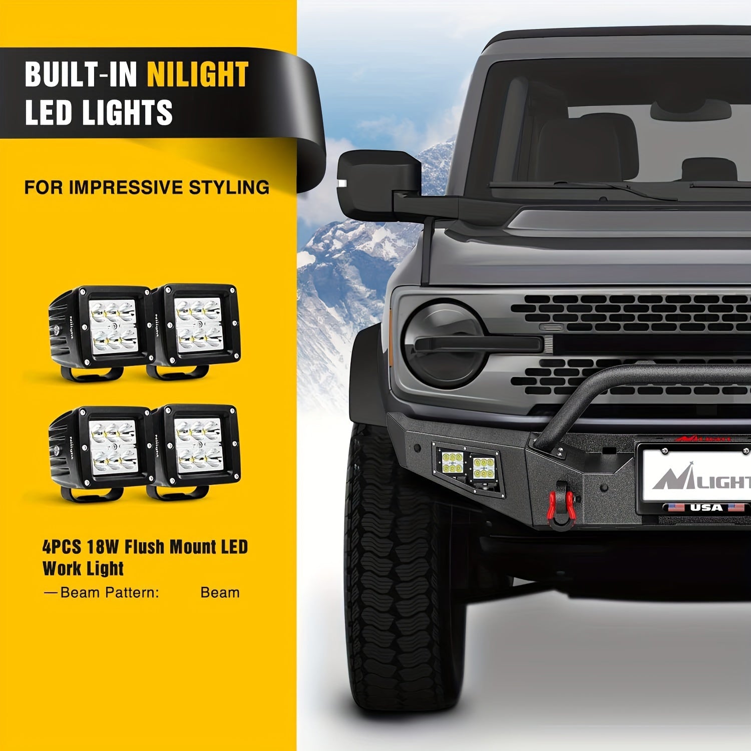 Nilight Front Bumper Compatible For 2021 2022 2023 2024 Ford Bronco With 4X18w Flush Mount LED Work Lights Winch Plate License Plate Bracket Sensor Hole