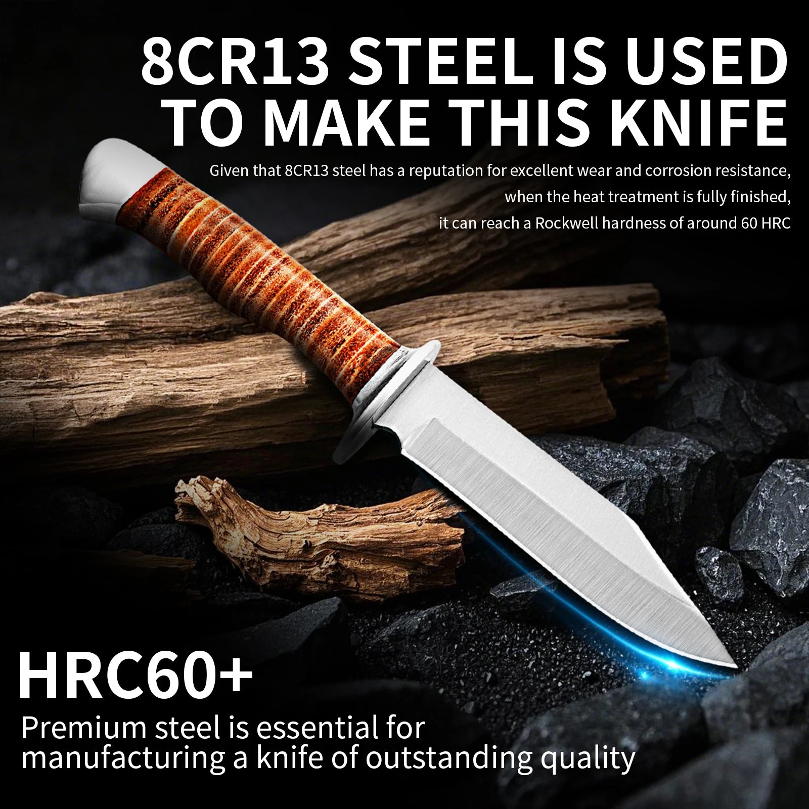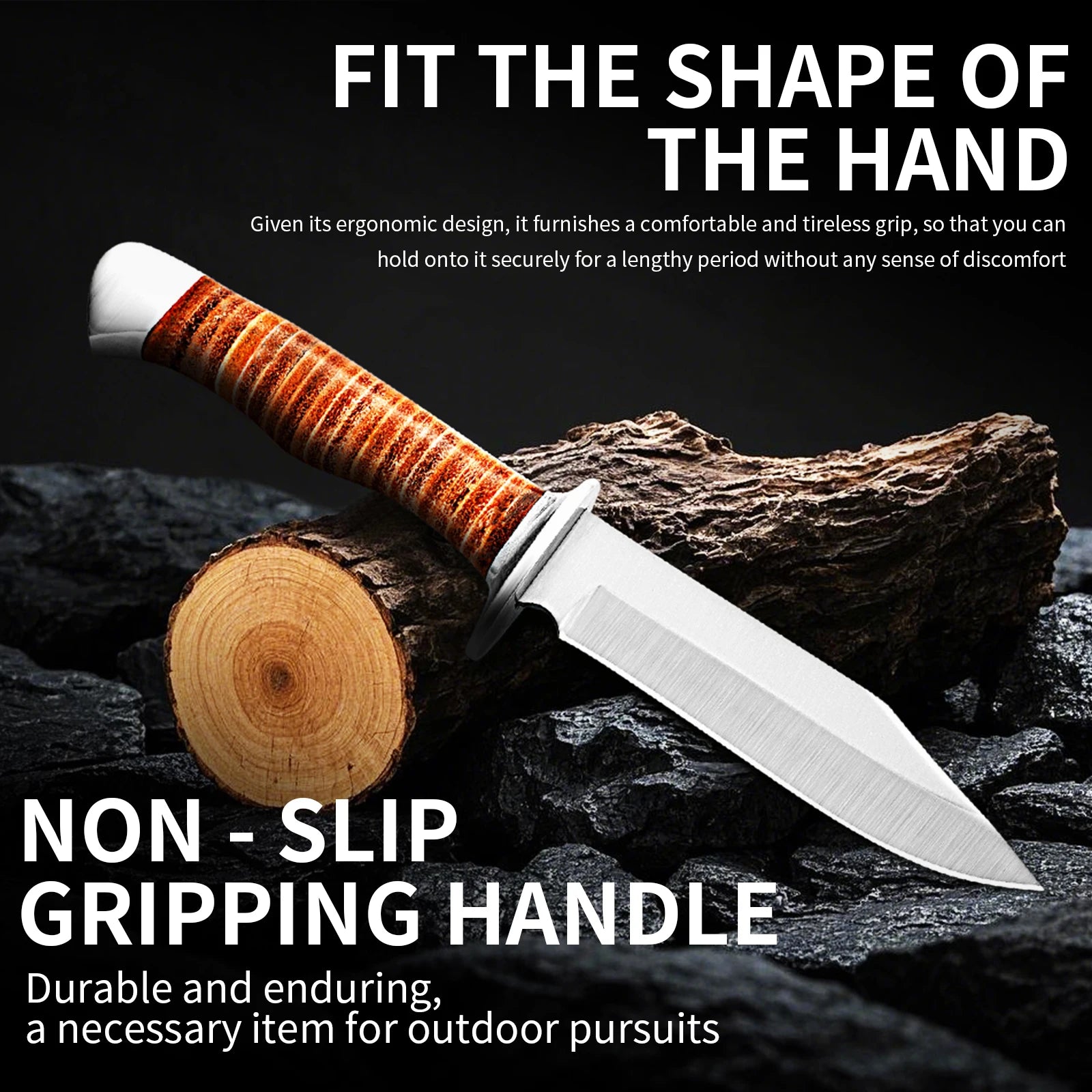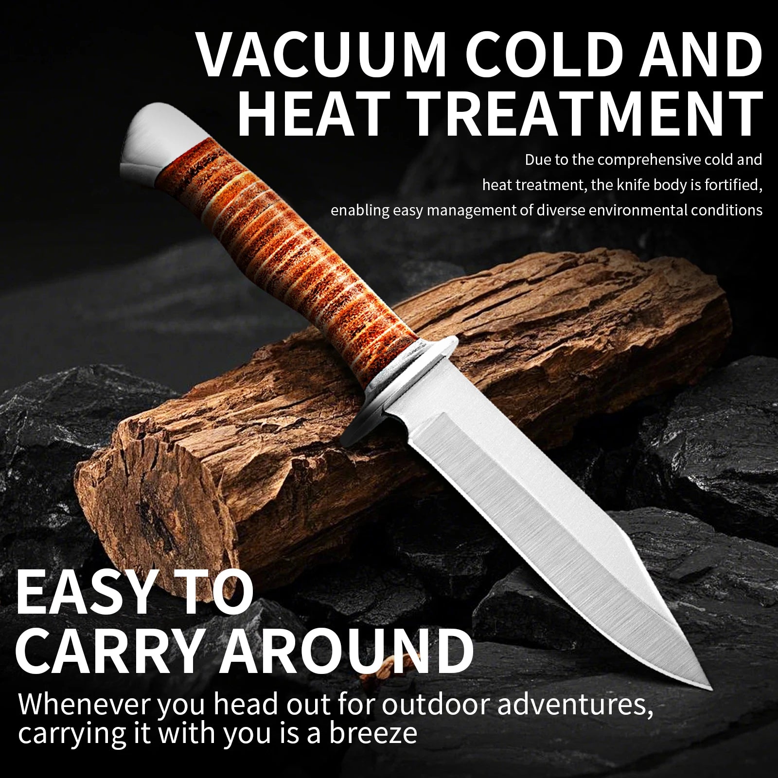 Outdoor multi-purpose knife with anti-slip handle, stainless steel hand-forged blade, essential for wilderness survival.