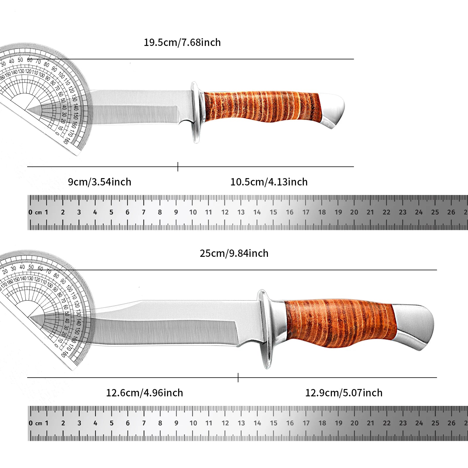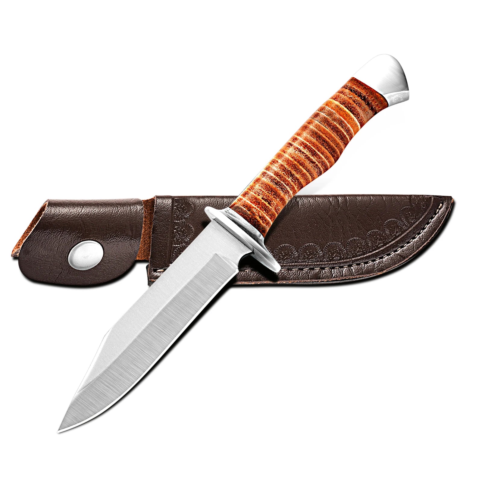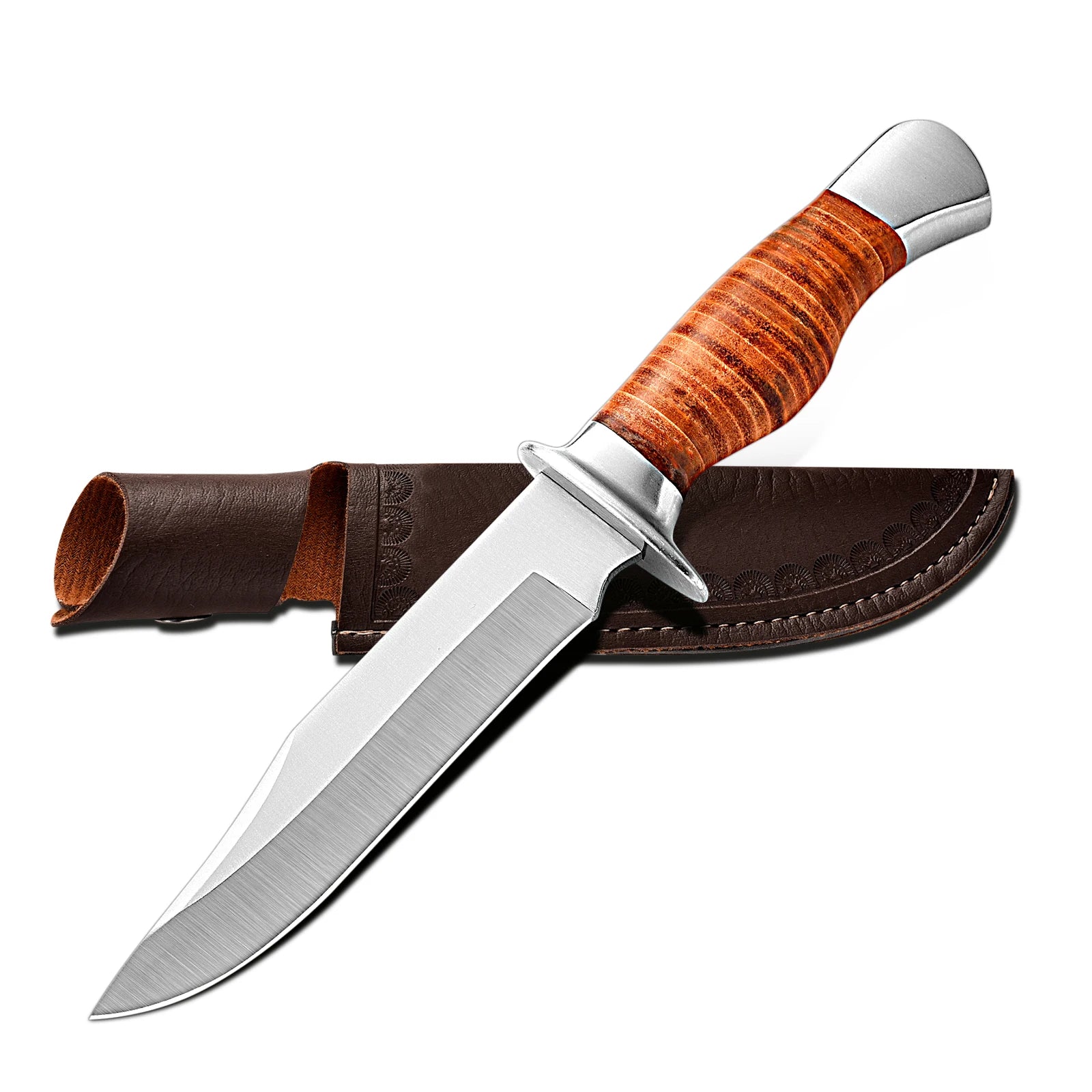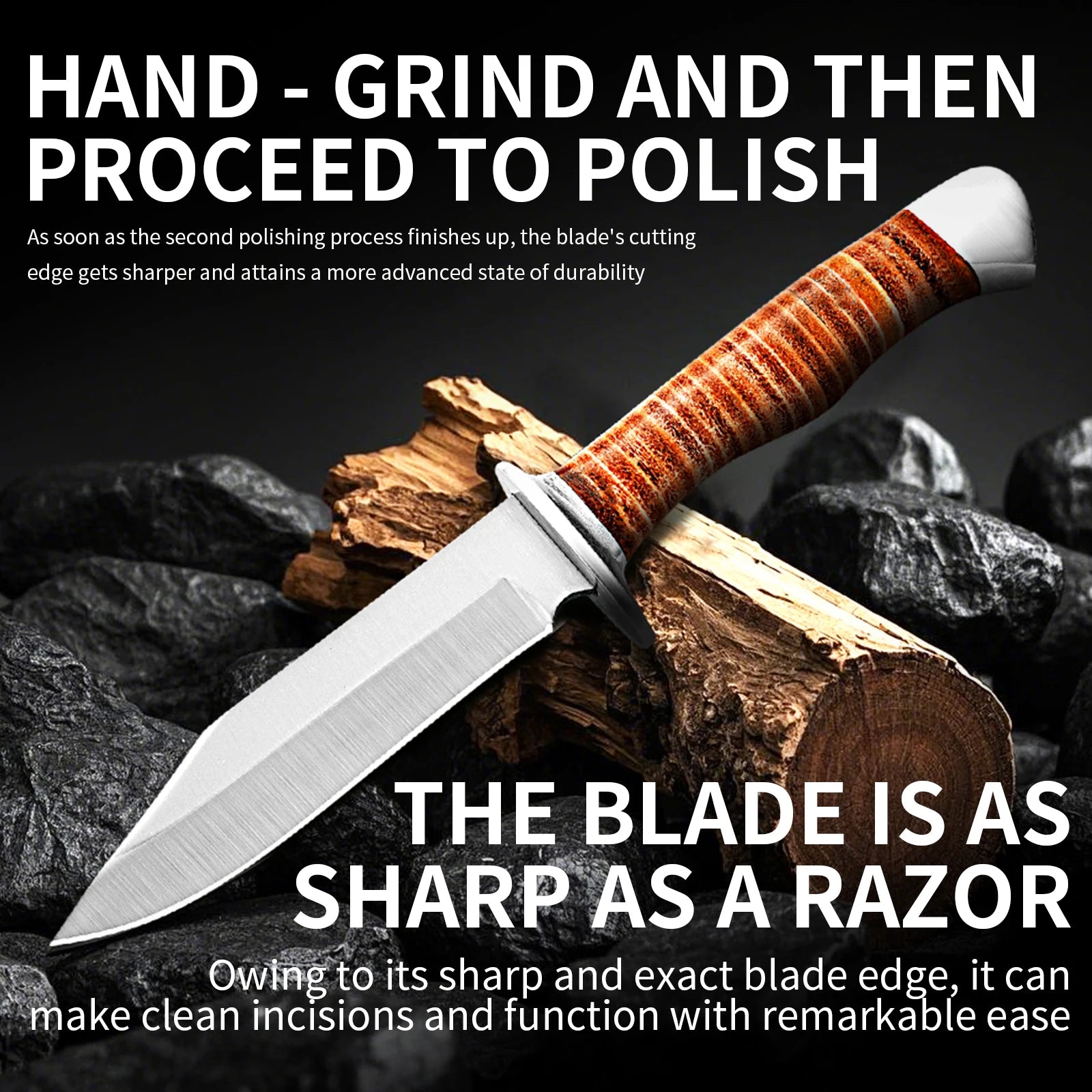 Outdoor multi-purpose knife with anti-slip handle, stainless steel hand-forged blade, essential for wilderness survival.