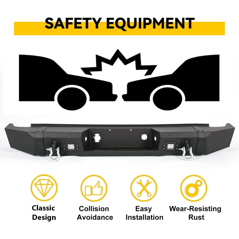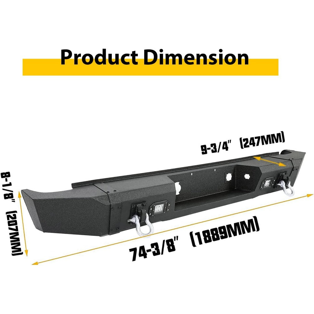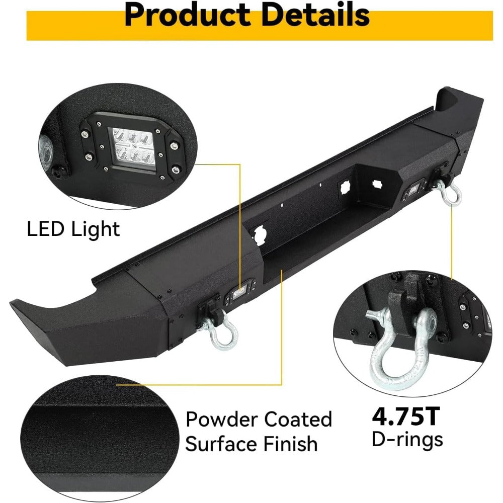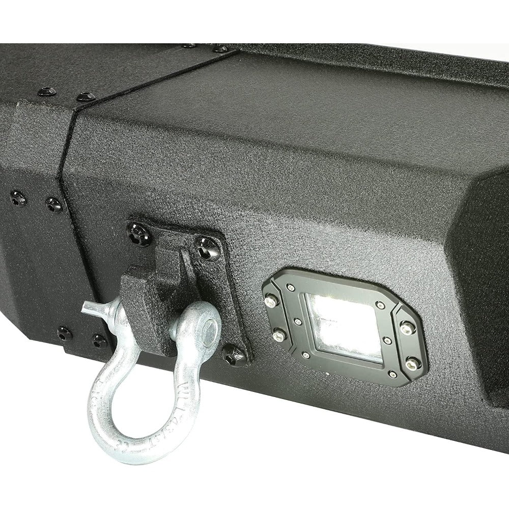 HEAVY DUTY: Rear Bumper is made of heavy-duty steel with 2 LED lights and 2 D-rings. Built to strict quality standards. This bumper is finished with a powder coating that provides protection to the surface, effective rust prevention, and improved durability.